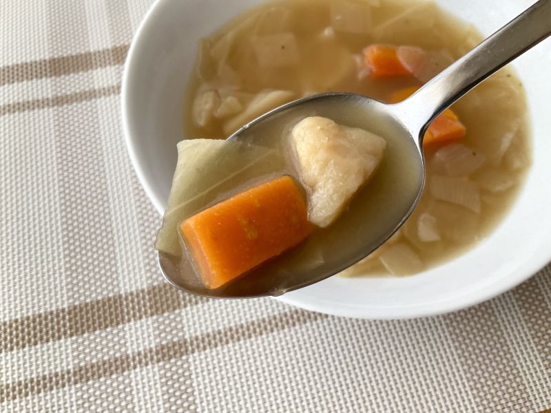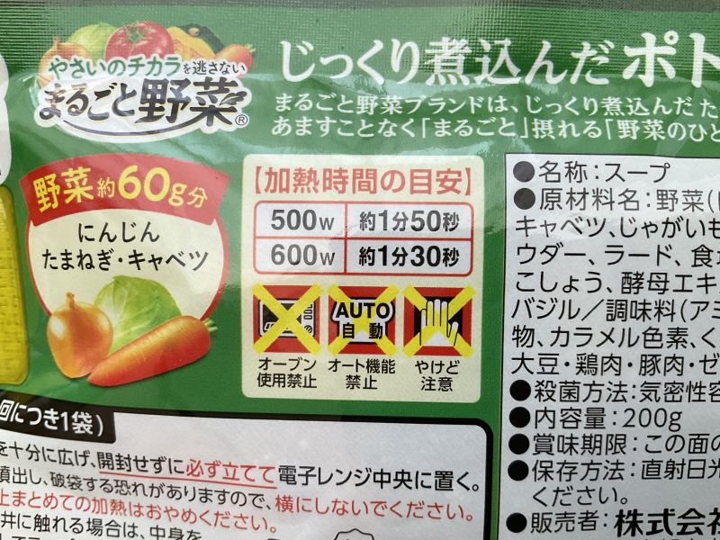 レンジで温めればすぐに食べられる「まるごと野菜 じっくり煮込んだポトフ」。にんじん、たまねぎ、キャベツ、じゃがいもが入った定番のスープです。筆者は普段からポトフを作るので、これはどんな味かな〜?とワクワクしながら購入しました!はたしてこの商品は、リピ買いすることになるのでしょうか?
