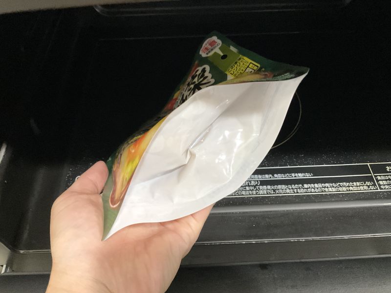 加熱中は袋がパンパンに膨らみますが、レンジの扉を開けるとすぐに蒸気が抜けて、見た目は元通りに
